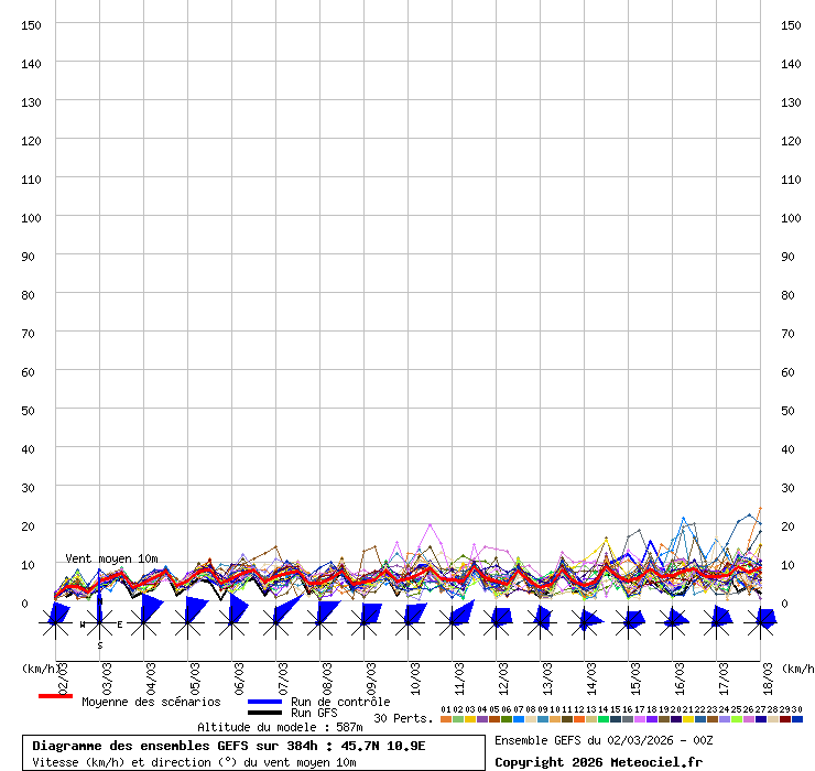In questa mappa gli "spaghetti" generati dalla tecnica Ensemble per tutti i modelli matematici di cui si dispongono i dati, per la località di Avio (Tn). La tecnica Ensemble consiste nell'effettuare più corse (più quella di controllo) modificando di poco e opportunamente le condizioni iniziali inserite nei modelli stessi per verificare variazioni e affidabilità nell'evoluzione prevista.